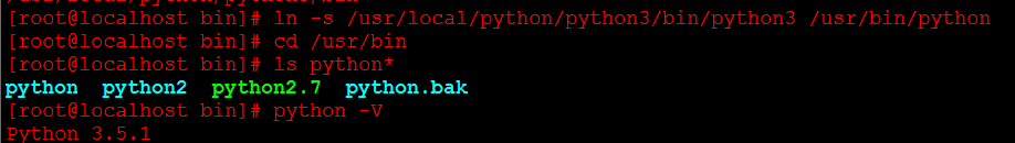 执行ln -s /usr/local/python/python3/bin/python3 /usr/bin/python命令创建软连接。执行python -V查看Python是否安装成功。