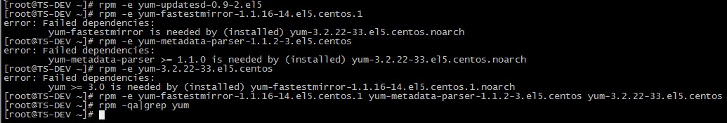 # rpm -e yum-fastestmirror-1.1.16-14.el5.centos.1 yum-metadata-parser-1.1.2-3.el5.centos yum-3.2.22-33.el5.centos
