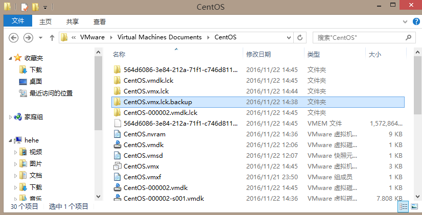 在这里我将文件夹centos.vmx.lck改为centos.vmx.lck.backup(其中centos.vmx是重启虚拟机后新建的):