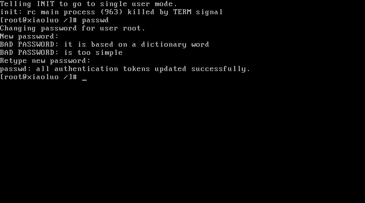 然后我们回车,进入到上层的界面,此时按下键盘上的 b 键就是启动操作系统,此时我们的linux操作系统就是以单用户的模式登陆了。我们发现系统非常快速的就进入到了命令行模式下的界面,因为单用户模式是不会启动任何服务的,同时也不需要输入root密码,就能直接进入到root用户下,此时我们就可以通过passwd 命令来重置我们的root用户的密码