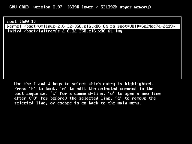 kernel /boot/vmlinuz-2.6.32-358.el6.x86_64 ro root=uuid=6e24ec7a-2d19-466e-bacc-92750b1f4bef rd_no_luks rd_no_lvm lang=en_us.utf-8 rd_no_md sysfont=latarcyrheb-sun16 crashkernel=auto keyboardtype=pc keytable=us rd_no_dm rhgb quiet