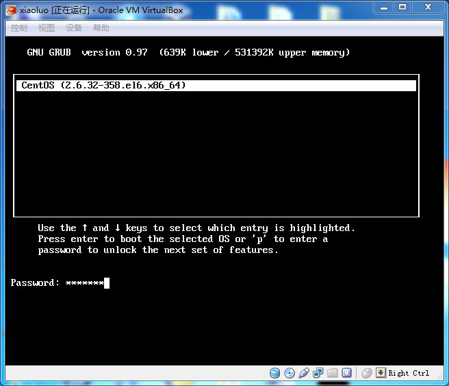 我们发现下面的英文提示已经变了,之前可以按键盘上的 e 键进入到grub里面,现在按 e 键已经没用了,此时提示我们按 p 键来输入grub的密码才能进入到grub里面