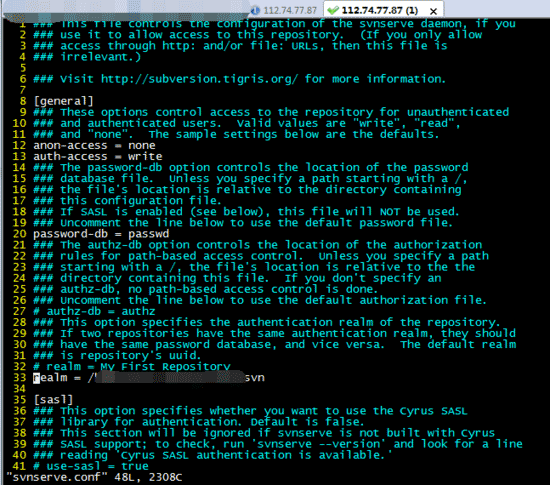 修改realm = /path/to/repo指定svn版本库。
