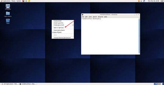 确定网络连接正常后,打开 centos 的终端,可在 centos 的桌面点击鼠标右键,选择 open in terminal ,如下图所示。