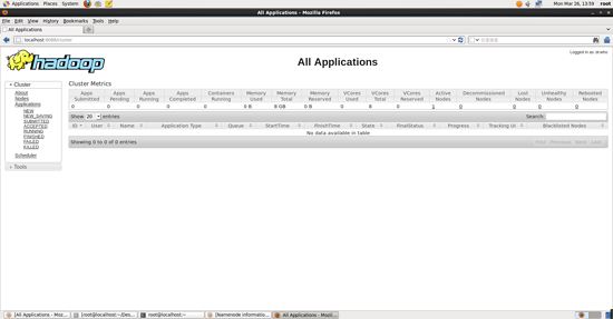 启动 yarn 之后,运行实例的方法还是一样的,仅仅是资源管理方式、任务调度不同。启动 yarn 有个好处是可以通过 web 界面查看任务的运行情况: http://localhost:8088/cluster 如下图所示。