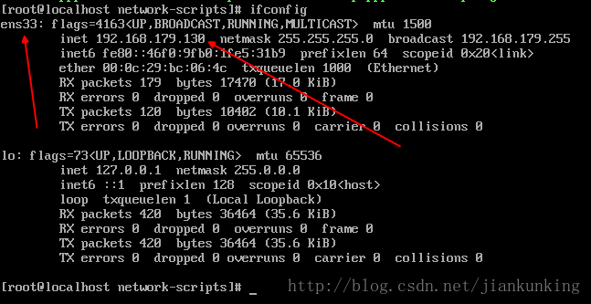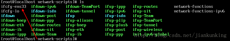 找到网卡配置文件名,这个网卡配置文件可以通过ifconfig命令查看,如下图,我虚拟机的网卡名称为ens33