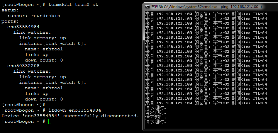 [root@bogon ~]# nmcli con add type team ifname team0 con-name team0 config '{"runner":{"name":"roundrobin"}}'