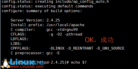 再执行echo$?如果结果是0,则说明httpd2.4.25到此编译成功,然后进行简单的配置,就可以使用了