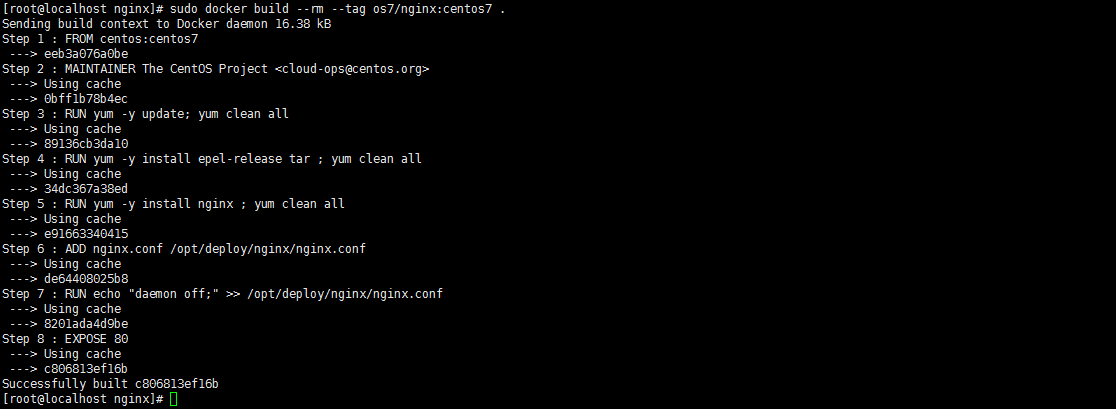 [root@localhost nginx]# sudo docker build –rm –tag os7/nginx:centos7 .