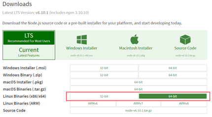 首先去nodejs官网下载https://nodejs.org/en/download/,32位或者64位自己选择,直接点右键复制链接地址(如64位:https://nodejs.org/dist/v6.10… )。