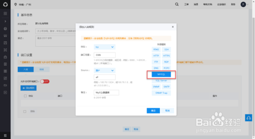 5、这时会弹出【添加入站规则】对话框,右边有一些常用的快捷模板,比如要打开MYSQL 3306的端口可以直接点击右边的【MYSQL】。模板没有的可自行添加。