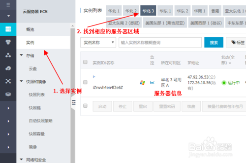 选择实例菜单,然后在界面的上部找到你所购买的服务器所在的区域,比如华北、西南等,然后点击选择。找到正确的区域后,中间就会显示你已经购买了的服务器ECS服务器实例的信息。