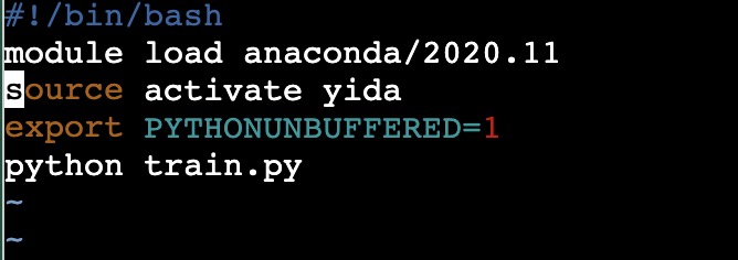 vim进入编辑,run.sh长这个样本,每次提交任务时会默认调用run.sh脚本,它会自动切换到Anaconda的虚拟环境 [yida],然后执行 [python train.py]所以你在这个目录下要有这个./run/train.py文件,提交任务的时候会自动调用它,你可以编辑指定python文件。