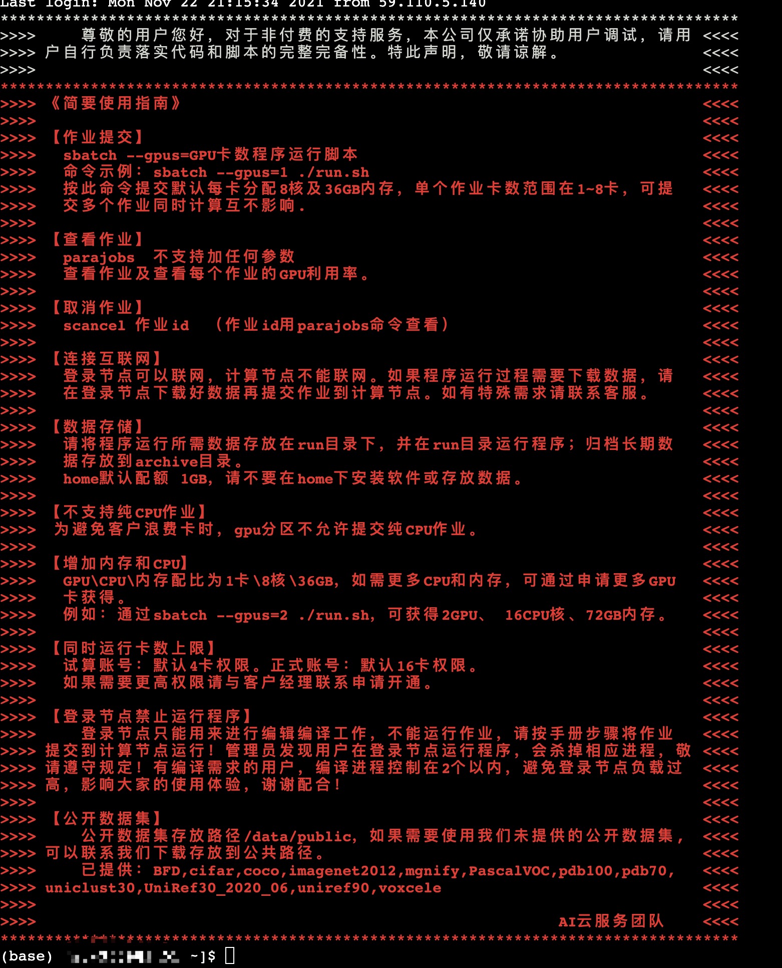 进入服务器之后,你会来到这样的界面,如果你想要创建Anaconda的环境的话,你可以联系工程师给你安装好以及对应的Ptorch环境,你会的话你就自己配置。配置好之后,你的环境和你账号是绑定的,一直有效(这点真的很棒)!
