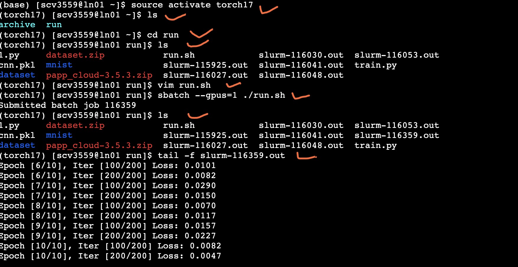 [source activate torch] :如 source activate 环境名 [ls]查看文件 [cd run] 运行代码需要将代码和数据集放到run目录下 [ls]查看run文件下有哪些文件 [vim run.sh]查看run.sh, 提交任务会默认调用run.sh脚本, [i]进入编辑模式修改参数到和你自己文件匹配才行, [esc][:wq]保存并退出 [sbatch --gpus=1 ./run.sh]申请1个显卡,并提交任务到服务器上,会自动执行run.sh脚本,申请多张显卡可以看红字教程,只有调用GPU提交任务到服务器上时才会计费 ->提交任务后,会显示一句话 [Submitted batch job 116359] 你代码的输出会被记录并保存在116359这个文件中 [ls]查看输出文件,它的全名叫[slurm-116359.out][tail -f slurm-116359.out]查看输出信息 [squeue]查询执行中的任务 [scancel 116359]取消作业 基本操作: 删除:[rm *.out*] 移动:[mv 文件 target] SSH登录:[ssh 用户名@IP地址 -p 端口号]
