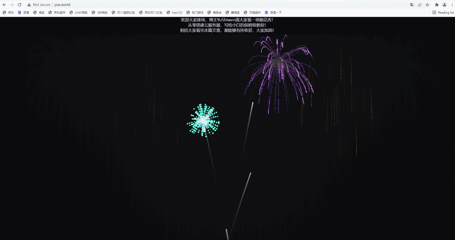 笔者已从零搭建好云服务器,在文章开始笔者请大家看一场简单的烟花秀,该篇博文是写给小白的保姆级教程,不论是有基础还是没基础的,都可以根据本篇博文,轻松搭建个人云服务器。