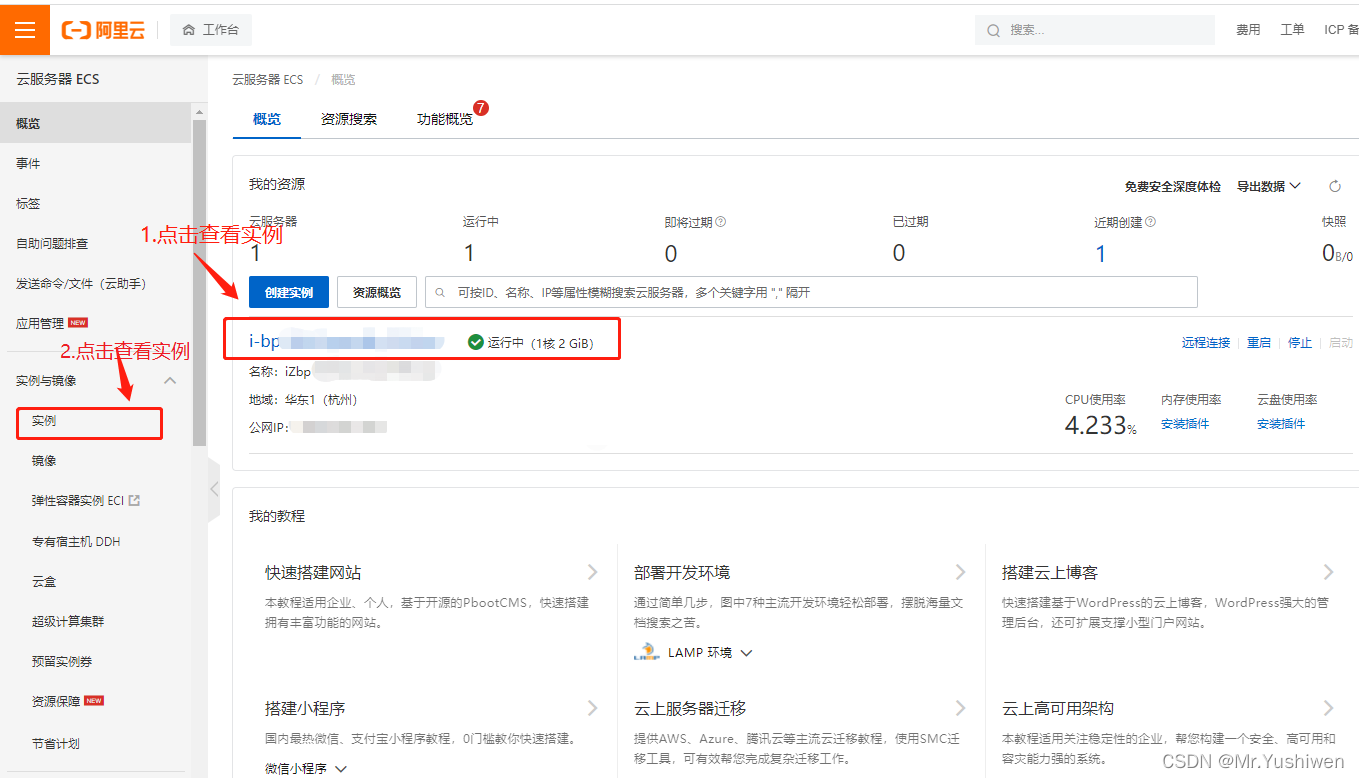 刚才我们购买了一个服务器,已经自动为我们创建好了一个实例,现在我们查看实例的方式有两种,如下图所示,