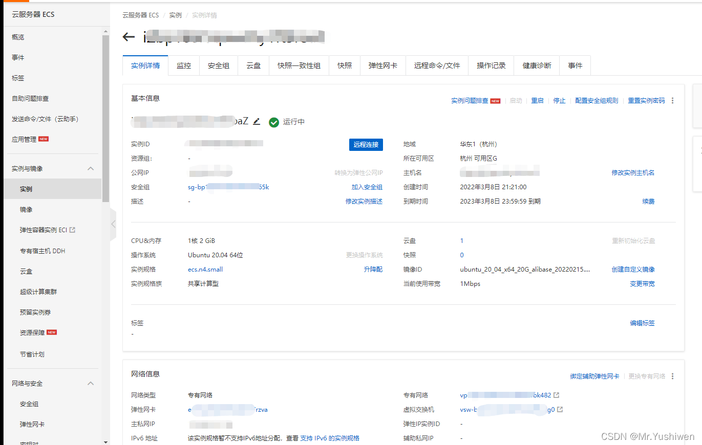 1个CPU; 2GB内存; 41GB的云盘,这里可以理解成物理机的固态硬盘(SSD); 操作系统选择的是Ubuntu; 带宽是1Mbps,即1024Kbit/s(1秒最多传输1024位),即128KByte/s(1秒最多传输128个字节); 地域的话选择离自己更近的地方,这样速度会快一点; 其他参数就按照默认来就行。