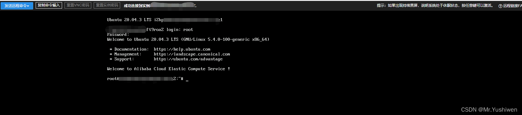 现在我们用VNC进行登录,这里对比一下Workbench,Workbench相比VNC的优势一是屏幕更大,二是可以和主机电脑之间进行复制操作,所以笔者这里推荐大家使用Workbench进行登录。 VNC 登录是阿里云为用户提供的一种通过 Web 浏览器远程连接云服务器的方式。在没有安装远程登录客户端或者客户端远程登录无法使用的情况下,用户可以通过 VNC 登录连接到云服务器,观察云服务器状态,并且可通过云服务器账户进行基本的云服务器管理操作。