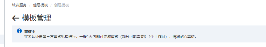 选好要购买的域名后,需要创建一个个人信息模板,进行个人的实名认证,之后提交,等待第三方机构审核(这个信息模板审核也可以提前创建)。