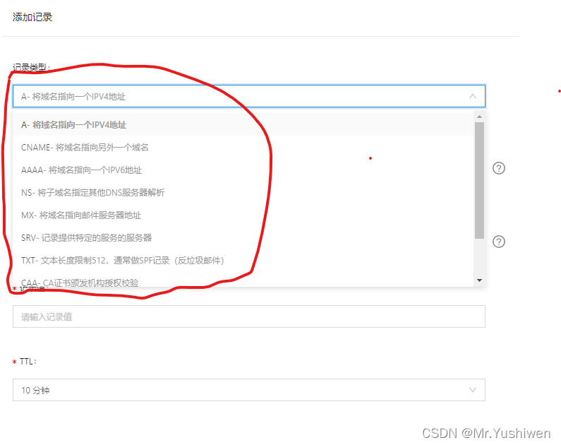 云解析支持的记录类型包含: