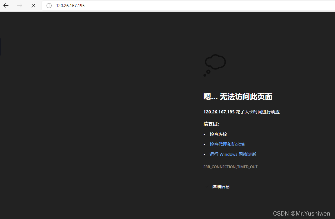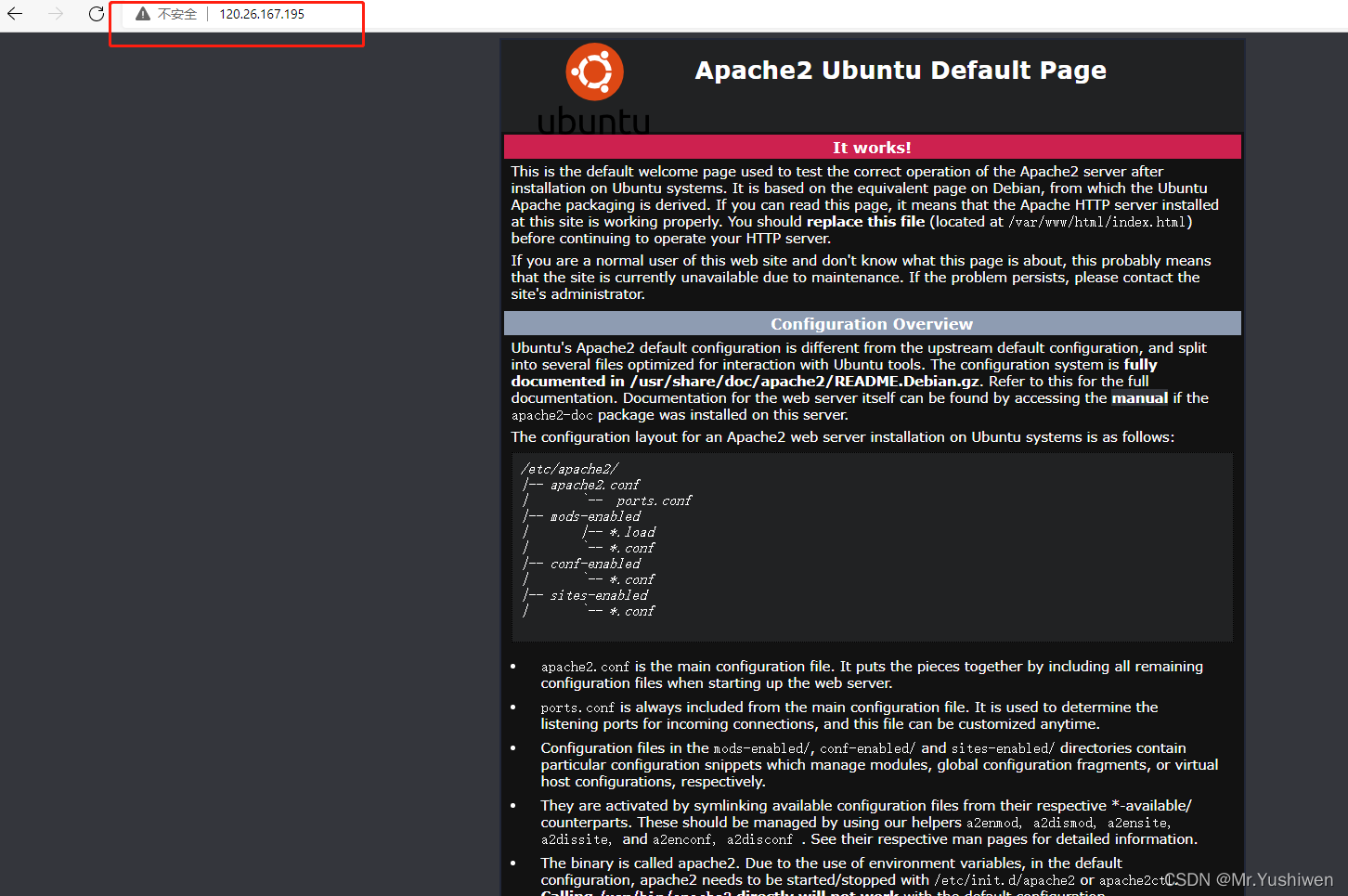 下面我们访问http://120.26.167.195/应该会得到apache的欢迎页面,但是实际中却报错了,如下: