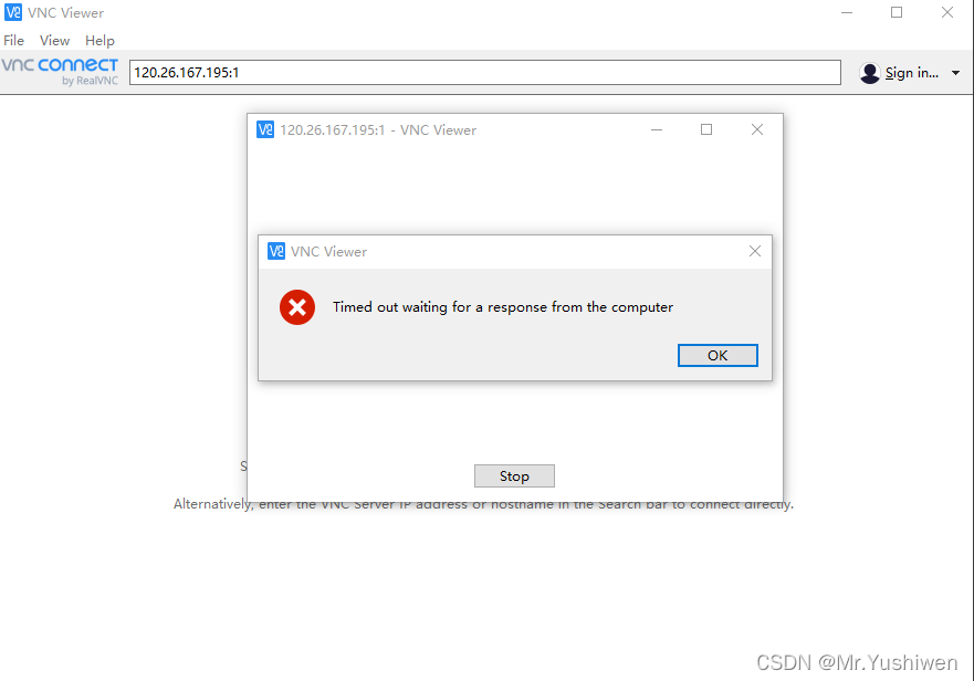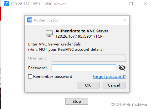 在 VNC Viewer 软件中,输入 云服务器的 IP 地址:1,按 Enter