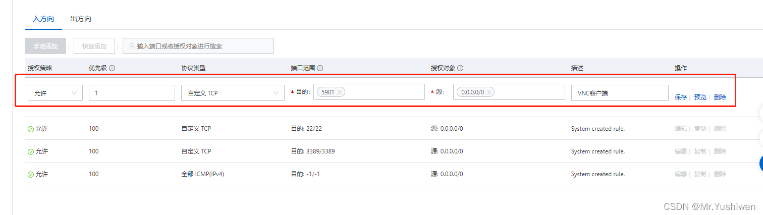 这是因为VNC远程桌面被Linux自带的防火墙阻挡了,VNC 服务使用 TCP 协议,默认使用5901端口。则需在实例已绑定的安全组中放通5901端口,即在“入方向”中添加放通协议端口为 TCP:5901 的规则。