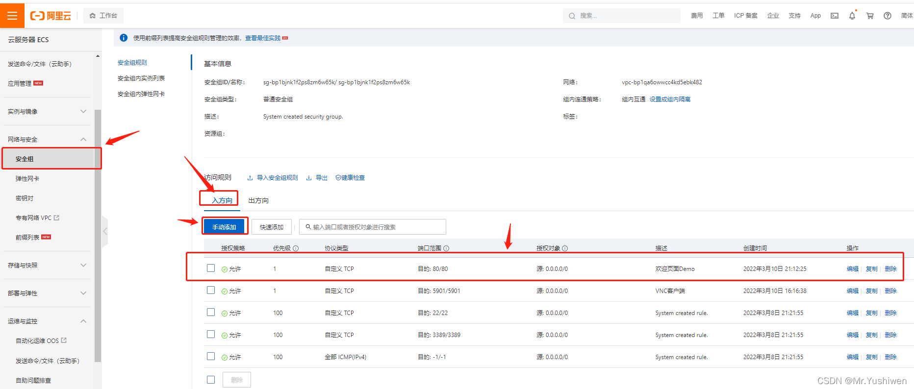 这是为什么呢,还记得在6.3章节中我们讲到,Linux自带的防火墙,它会阻挡80端口,我们需在实例已绑定的安全组中放通80端口,即在“入方向”中添加放通协议端口为 TCP:80的规则,如下图: