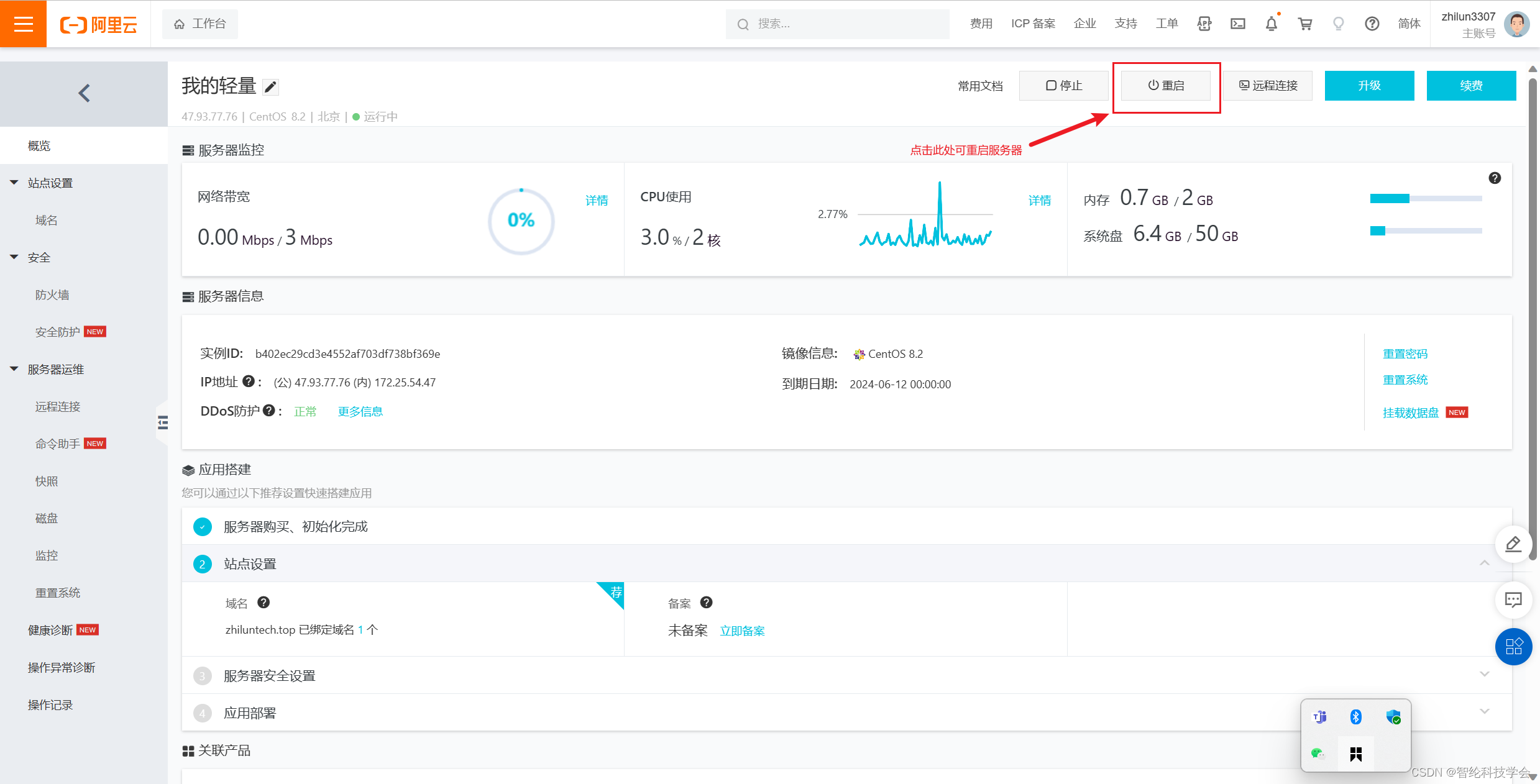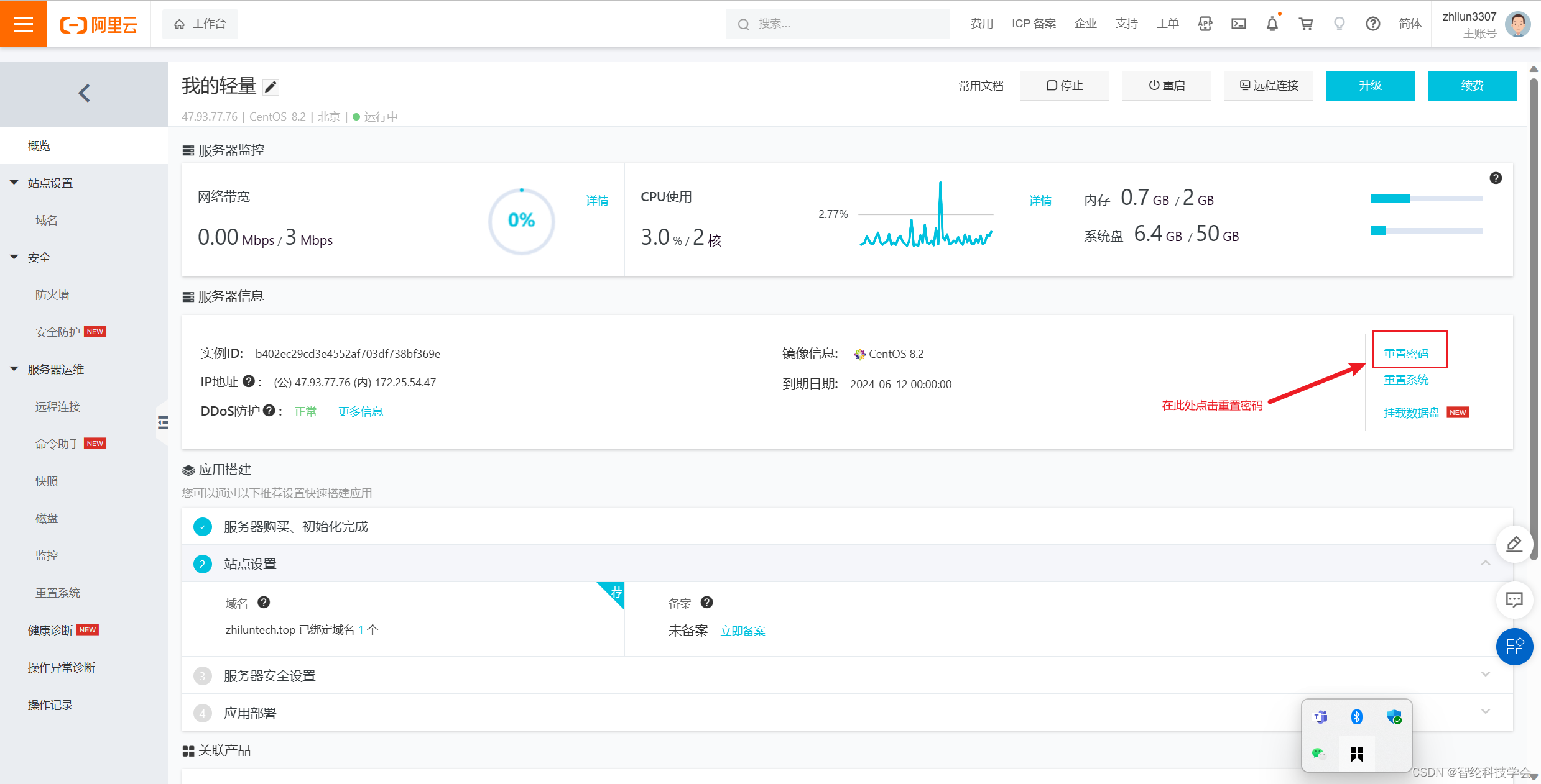 如上图为阿里云服务器首界面,详细地写明了服务器的公网ip,购买日期以及配置等相关信息。