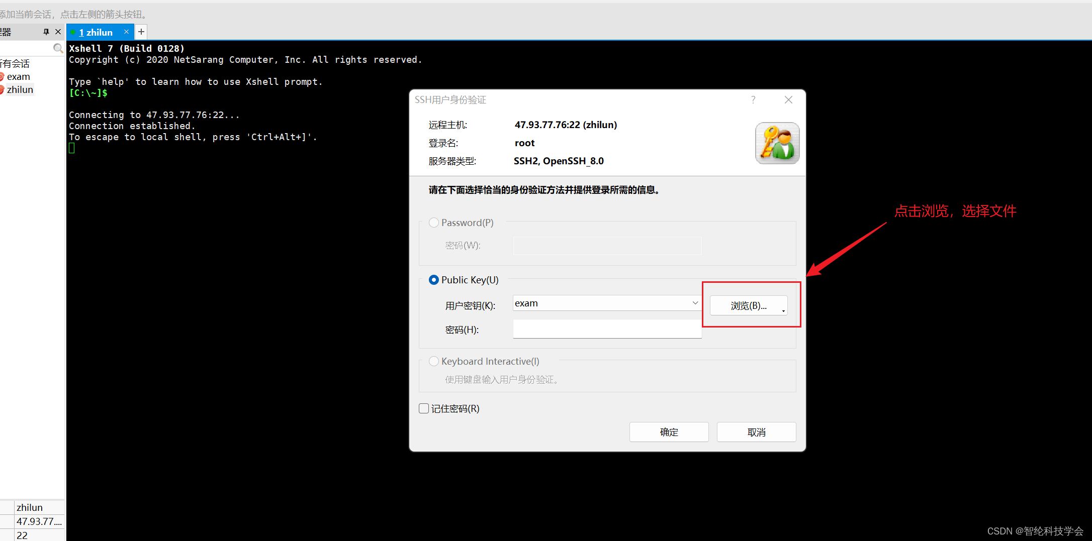如上图,选择Public key,点击右侧浏览,点击文件,找到密钥文件的位置点击打开,密码不用输。最后点击确定。