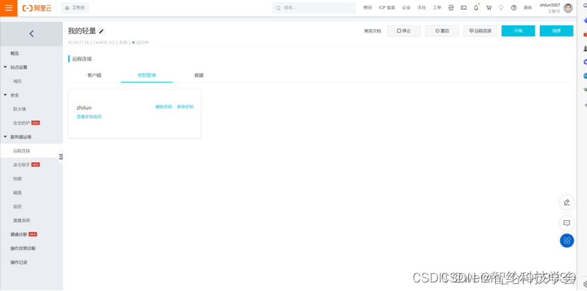 进入服务器首页面,点击左侧的远程连接(云服务器ECS的话点击密钥对,创建密钥),点击密钥管理。因为我这里已经创建了密钥,所以无法再创建。如果没有密钥,则点击创建密钥,输入密钥名称(随机取名)、资源组名称(服务器首页可以找到,就是实例ID,在创建页面可以下拉输入框,一般都会默认已有的服务器)、以及公网ip。点击确定。