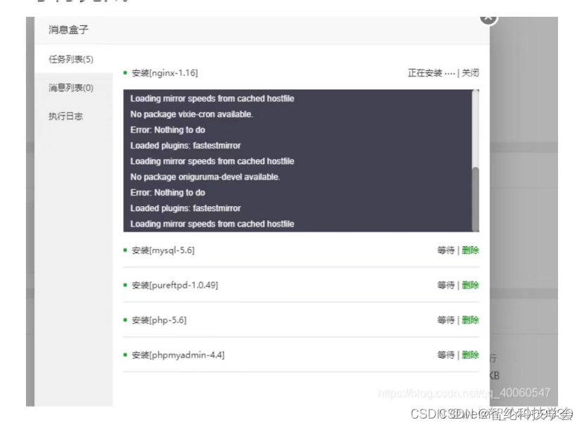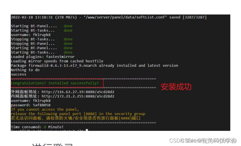 如上图,在绿色光标位置输入安装指令,按下回车键开始安装,安装时间大概五分钟,期间不要退出面板。安装完成后如下图所示(安装期间会有两个选项,全选y即可)