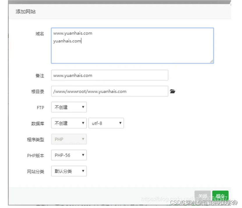 输入网站域名(如果没有域名可以直接用公网ip,格式:公网ip:+端口号+.com(其他的也行)注:端口号随意取,只要在允许范围内即可,端口必须在服务器中放行),其他的选项可以根据需要更改(可以选择默认,主要看服务器配置如何),最后点提交。