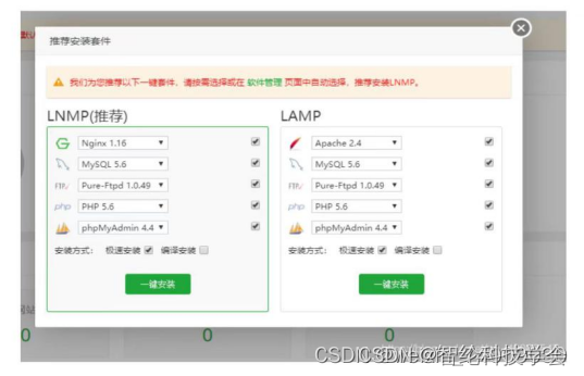 如图,登录宝塔后会弹出相应的安装界面,推荐选择左边的LNMP(兼容性好一点),根据需要选择插件版本(默认的是适配版本,服务器牛逼的话可以全部装最新版本)
