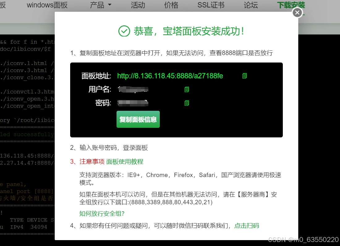 安装完成后会弹出宝塔访问链接和用户名密码