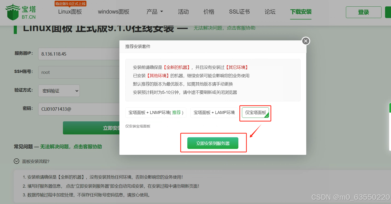 安装宝塔时选在线安装,输入ip密码就可以自动安装了