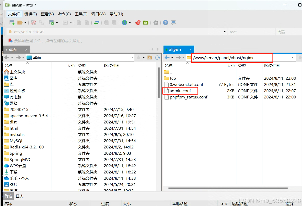 使用xshell连接到服务器后,点击上方的xtfp图标连接,将admin.config拷贝到/www/server/panel/vhost/nginx目录下